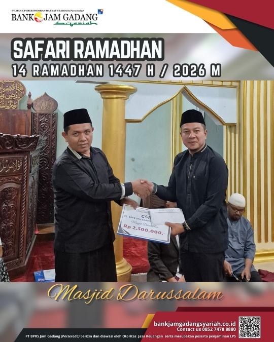 Alhamdulillah, PT. BPRS Jam Gadang (Perseroda) melanjutkan rangkaian Safari Ramadhan dengan mengunjungi Masjid Darussalam pada 14 Ramadhan 1447…
